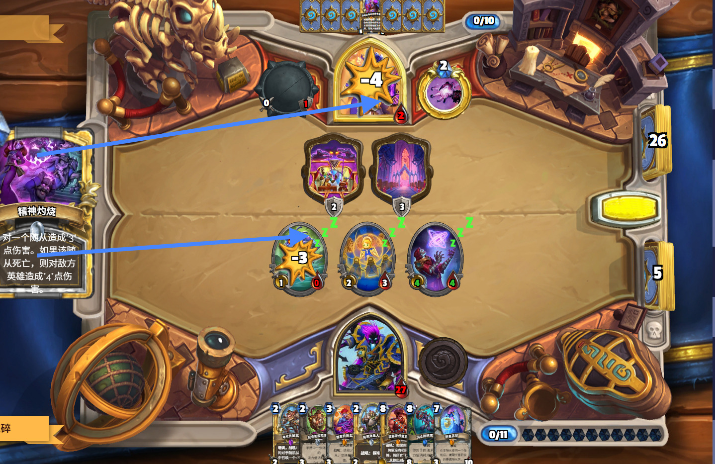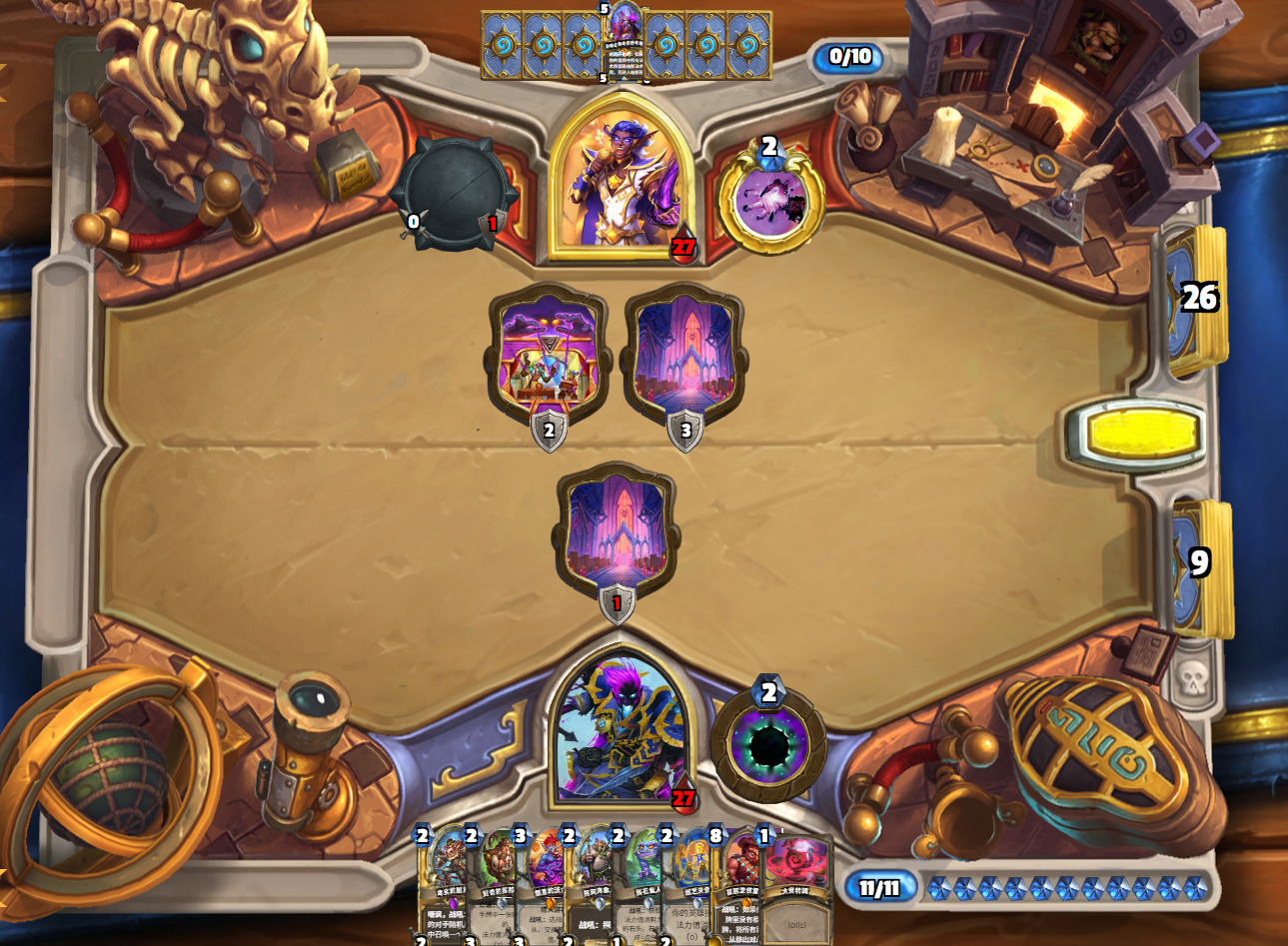 然后是打术士的一局,前期装模作样交互一下,一个小狂乱拽走21亡语直接赢