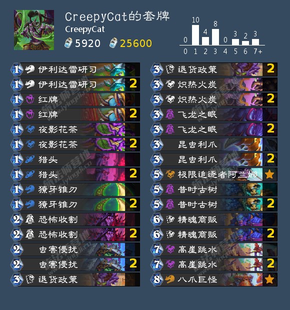 下面跳转这套,武器滤抽亡语,可以选择把减费后的游客捏着也可以直接游客花茶加休眠,两回合之后打出退货斩杀