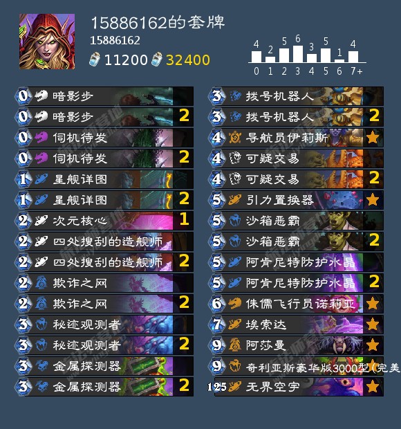 国服1500分段三连胜 伊利斯通常拿一费,最好拿复制,然后是找法术,无脑复制各种组件就好了,找法术能找到回手也很香 回手法术十分灵活。所有战吼随从都有回手的价值。随机应变就好了 通常是埃索达收组件,回手埃索达。 也有一个操作,回手小沙箱偷费用腾手牌下阿莎曼。 伊莉丝回手也可以,不过太卡格子了 新版本幸运彗星发现池被污染了,就不带了 沙拉达经常手牌太多开不出来,而且也不好腐蚀,也没带 这卡组有点怕快攻。最怕的是火凤贼这种卡组,基本完全没法打。所以补丁后环境似乎好了很多。但是好像糊了的猪猪术也完全没办法打。鱼人骑似乎也不好打 碰到沙包战士和轮盘术时是最爽的。碰到一把战士,组了两个置换器,两个罐仓,两个首相,三个40攻星舰超杀对面两百血 但不知道加强了的任务体系会不会颠覆环境 如果缺卡的话还是观望几天最好