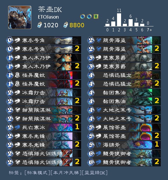 仅加入两张新卡恐惧迅猛龙。2费亡灵3费跳币迅猛龙+0费亡语的小combo尝试过两次,效果还挺好
