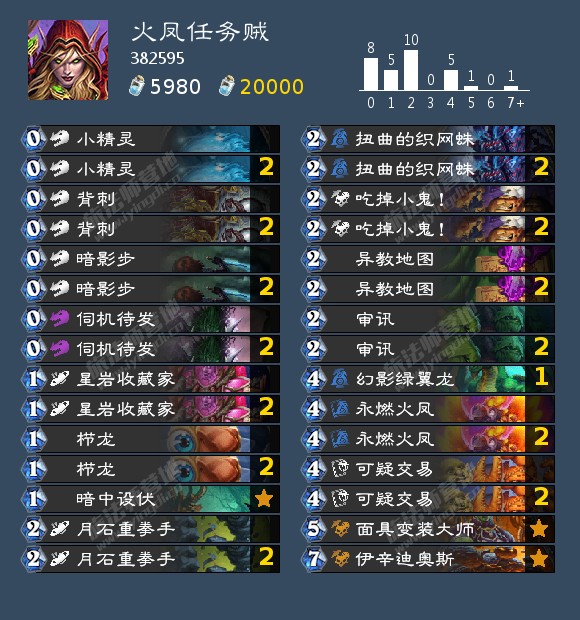 构筑思路:在火凤体系基础上,移除边缘卡“把经理叫来”以及体系终端(巨人、茶壶),加入任务体系。经过筛选,强力的做任务单卡包括小行星、审讯、幻影绿翼龙,这些卡牌在完成任务的同时也能带来收益。卡组的大终端选择了伊辛迪奥斯。本人尝试过谍战-挖宝体系和基尔加丹,但在面对战士和法师时表现不佳。谍战体系更多是娱乐性质,实战效果有限;盗贼的基尔加丹强度不足,难以对战士构成威胁,面对法师一旦被返场也会陷入被动,且基尔加丹会消耗掉潜行的忍者,导致关键回合无法借助buff施压,存在卡组内部配合冲突的问题。最终选择伊辛迪奥斯来提供爆发,其技能摇出的10点AOE直伤配合场上的潜行忍者,一回合可造成20+伤害,能给对手致命打击。