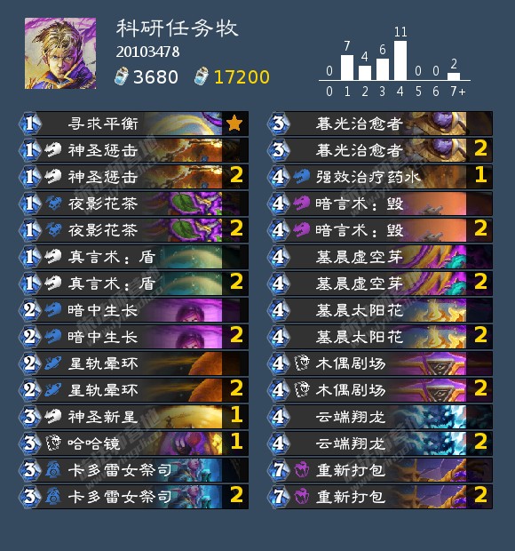 哦可啊新版本也是依旧非主流牧师,这套强度我感觉是打谁都46开,当然是我们4了…大概打法就是用牧师的小法术混一混前期顺便做任务,带了两张新卡复制元素用来复制任务奖励,然后华丽的打出3个88任务奖励压死对面(当然是幻想了)快攻留小解牌,神圣新星带一张的原因是我感觉环境里快攻没那么多了,快攻多可以多带一张aoe,甚至可以把火炭带上虽然它对我们的任务来说毫无用处。成功活下来并且拿到任务奖励的话建议直接拍,一般快攻受不了的慢速的话有灌注和两张地标可以拼资源,打可能会带鸡蛋的卡组请注意一定一定留一张地标在手上用来偷鸡蛋,直接放场上对面一般不会下鸡蛋的,而且慢速就意味这我们可以拍出三次任务奖励给满压力中速超展开卡组,后手留硬币,留毁和打包来处理超展开,还能忙里偷闲的用地标复制点优质随从最后,其实我科研的这套卡组很一般,想上分别玩