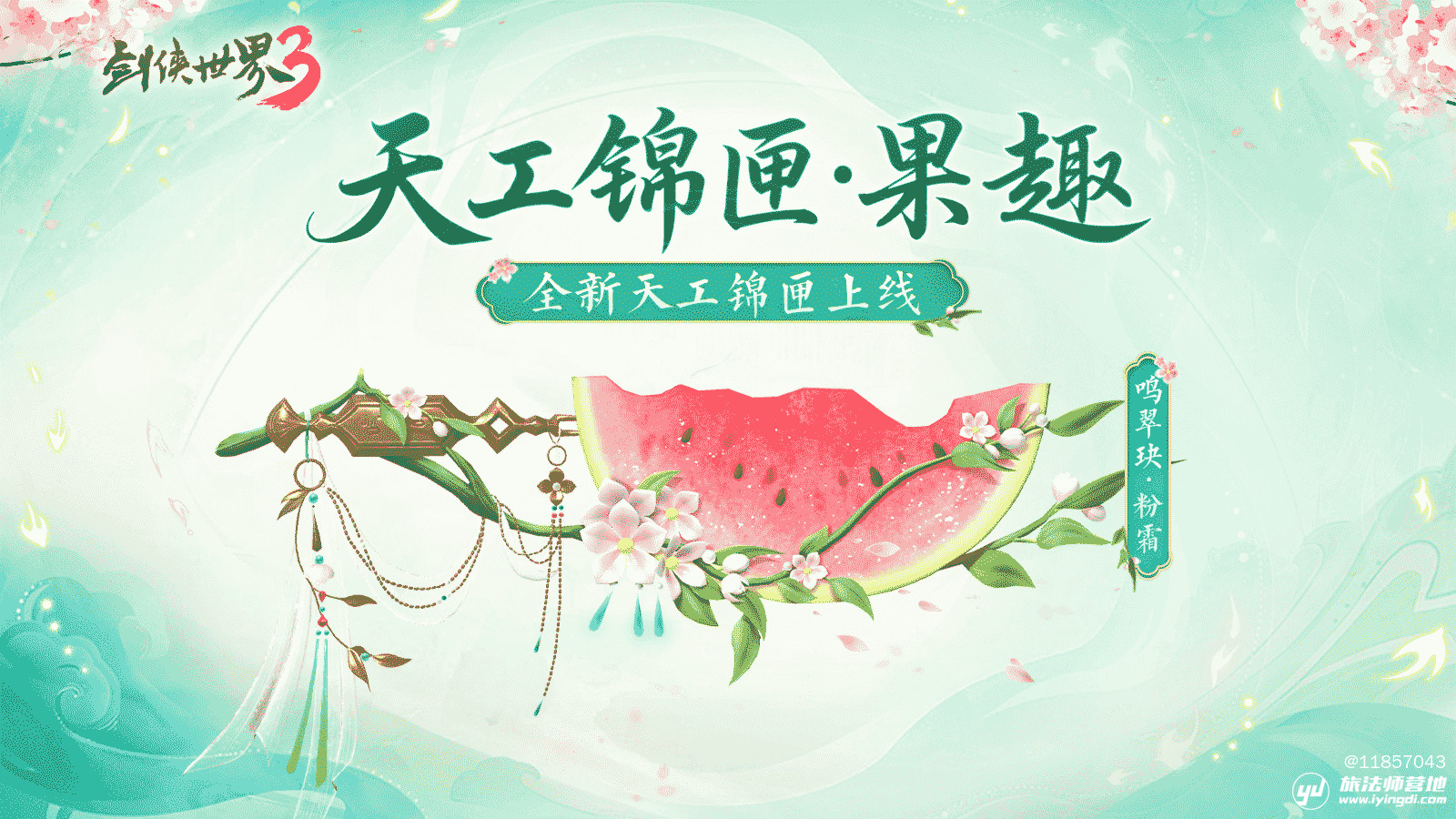 好多水果呀~全新天工锦匣·果趣上线!本次天工锦匣·果趣包含【鸣翠玦】系列、【叠金锷】系列、【缠玉珀】系列、【摇绛珠】系列、全新表情系列"萌趣江湖-记仇"等道具。嫩瓤凉瓠,正红冰凝结。腰饰含【鸣翠玦·粉霜】、【鸣翠玦·蜜蜡】两种偏色。西瓜和哈密瓜,少侠更喜欢哪个呢?小孩子才做选择,我全都要~【叠金锷】系列背挂以菠萝为主题,头饰【缠玉珀】系列以葡萄为主题,脸饰【摇绛珠】以樱桃为主题,珠帐夜不收,月明堕清影。多重水果主题新品,助力少侠夏日的江湖旅程清爽搭配~