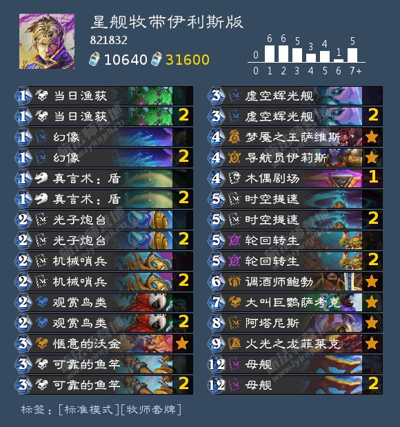 星灵牧强势崛起,本次推荐带伊利斯版(PS:版本首合就是伊利斯,必须要证明自己合卡不亏)。1到3费基本固定,4费剧场和梦魇,根据环境可换沉默或者岛民,7费鹦鹉和安布拉,我选择鹦鹉,安布拉如果没下过母舰,则它就只会站一个66,然后吼几只减费。而鹦鹉即可以7费准时下,也可以后期配合下,容错率高些。我这套鹦鹉更合适。9费火龙或者奇利亚斯。火龙博个梦想。