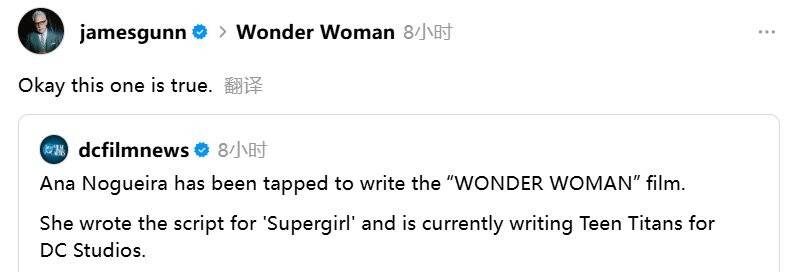 在《The Wrap》杂志爆料安娜·诺盖拉将执笔《神奇女侠》剧本后(她同时负责新版《女超人》和《少年泰坦》剧本创作),古恩在社交平台上确认了这一消息。