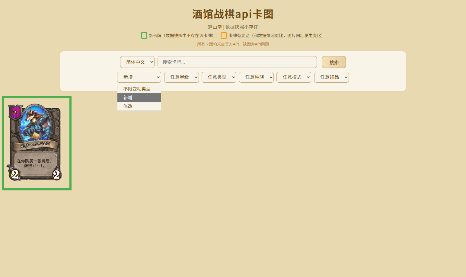 现在不是预览季了,为了说明就直接改了一下网页代码,如下图,大范英雄被标记成了修改,伙伴被标记成了新增,然后对变动类型进行筛选,就可以把这两张牌筛出来了