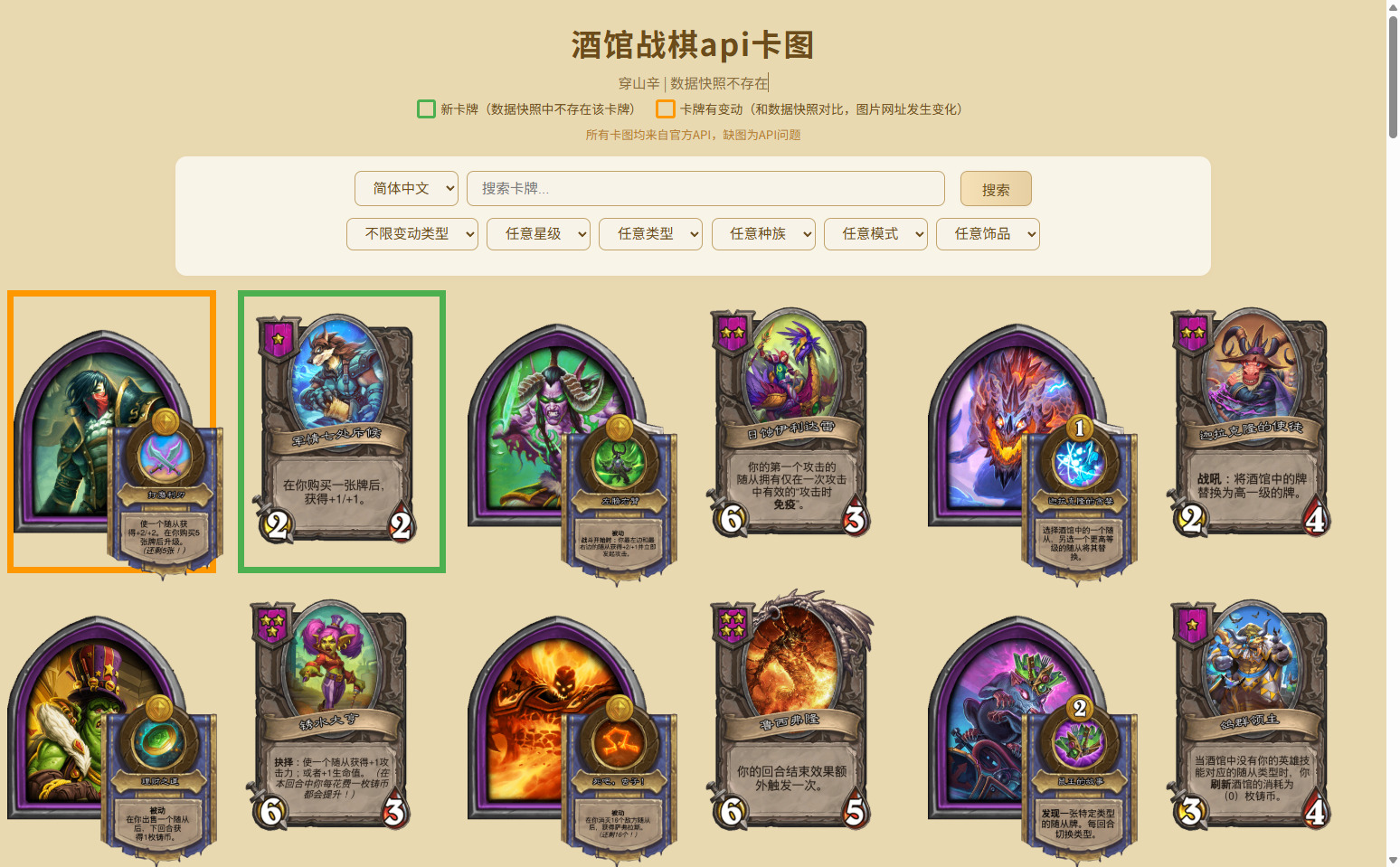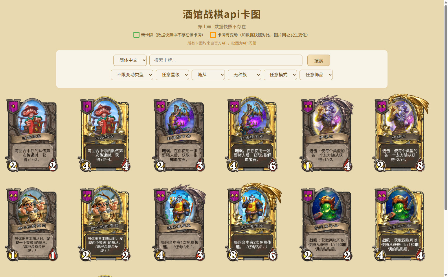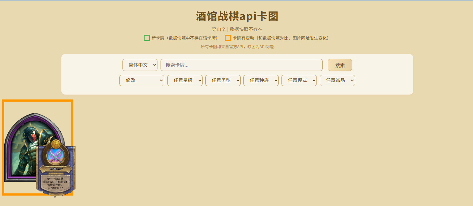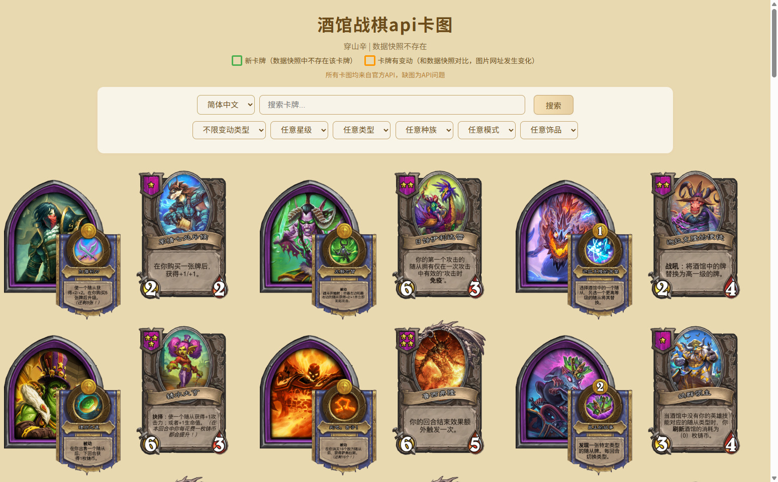 然后提一个官网没有的功能,就是这个卡查可以查询没有种族的卡图,原理是查到了有种族的随从就抛弃掉那张卡不显示,不过法术英雄伙伴等等不会抛弃,所以逻辑和查询野兽亡灵之类的情况略微不一样