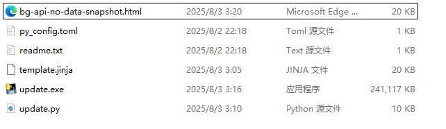 这个程序会根据以前的数据快照生成出来bg-api.html,并打开这个新生成的网页,然后再根据现在的数据生成一份数据快照