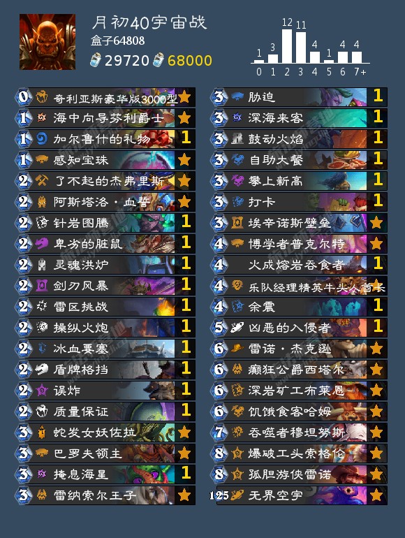 狂野10星六十胜率终于2号上传了,稍微改了几张卡之后胜率明显提高,遂跟大伙分享 最近几个月大伙宇宙战都见得很多了,就只讲讲卡牌改动和优劣对局吧卡牌改动:1.新任务: 新版本更新的时候尝鲜带了一阵子,天梯碰到的很多宇宙战也仍然带着。我的评价是百害无一利。打快攻纯卡手,打慢速不考这个赢。内战进可以鲍勃抢任务,退可以蒸汽机器人撕奖励,0分卡2.小解牌: 在宇宙战原有的基础上加入了大量小解,误炸,雷区挑战,冰血要塞,打卡等等。保证我们大概率在二费最晚三费能解掉3血的怪。并且在我们成长起来之前持续护脸,也是月初抓快攻的保障。3.牛 牛里带蒸汽机器人,恶鬼,鸡蛋。恶鬼有待商榷,但是我总觉得它能撕点什么4.蛋盾: 不亚于125甲,能有机会赢手速牧,元气骑靠的就是这张卡,上手就能宣告胜利。打快攻也能拖住一回合雷诺翻盘5.掩息海星 如果可以我希望能带10张,打弃牌术大哥萨以及处理手速牧剩下的两只大野猪尤其好用优势对局:暗牧,龟法,大哥萨,手速牧均势对局:弃牌术,宇宙术,元气骑,40德鲁伊,内战劣势对局:圣契骑,星界德,弑君贼,