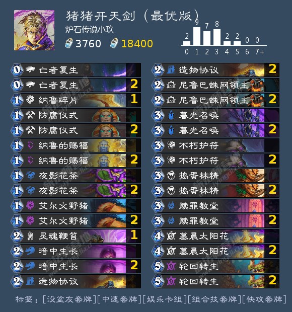 卡组携带了轮回转生,配合抗快攻的树精,打中慢速的蜘蛛,和卡组核心猪猪,前期按费拍怪中期靠复活返场和恶心人,实战打下来发现树精基本上不卡启动回合,打慢速甚至可以考虑不下