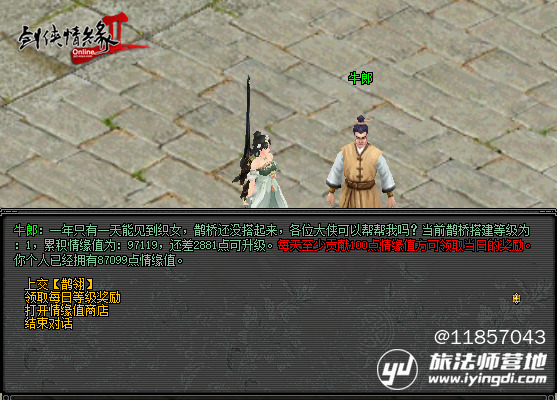 8月21日-9月17日,大侠参与游戏内副本可额外获得【鹊翎】,将其上交给成都的牛郎,可共同助力鹊桥升级。当鹊桥等级达到10级,牛郎织女将幸福相会!鹊桥等级越高,大侠收获的奖励也会更丰厚。