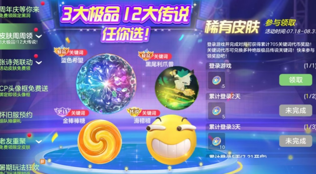 8月29日至9月11日期间,参与组队对战即可领取CP时效关键词!完成对局更能获得永久热门皮肤!包括「爱的么么哒」、「单身贵族」、「单身汪」等多款人气皮肤,机会难得,千万别错过!