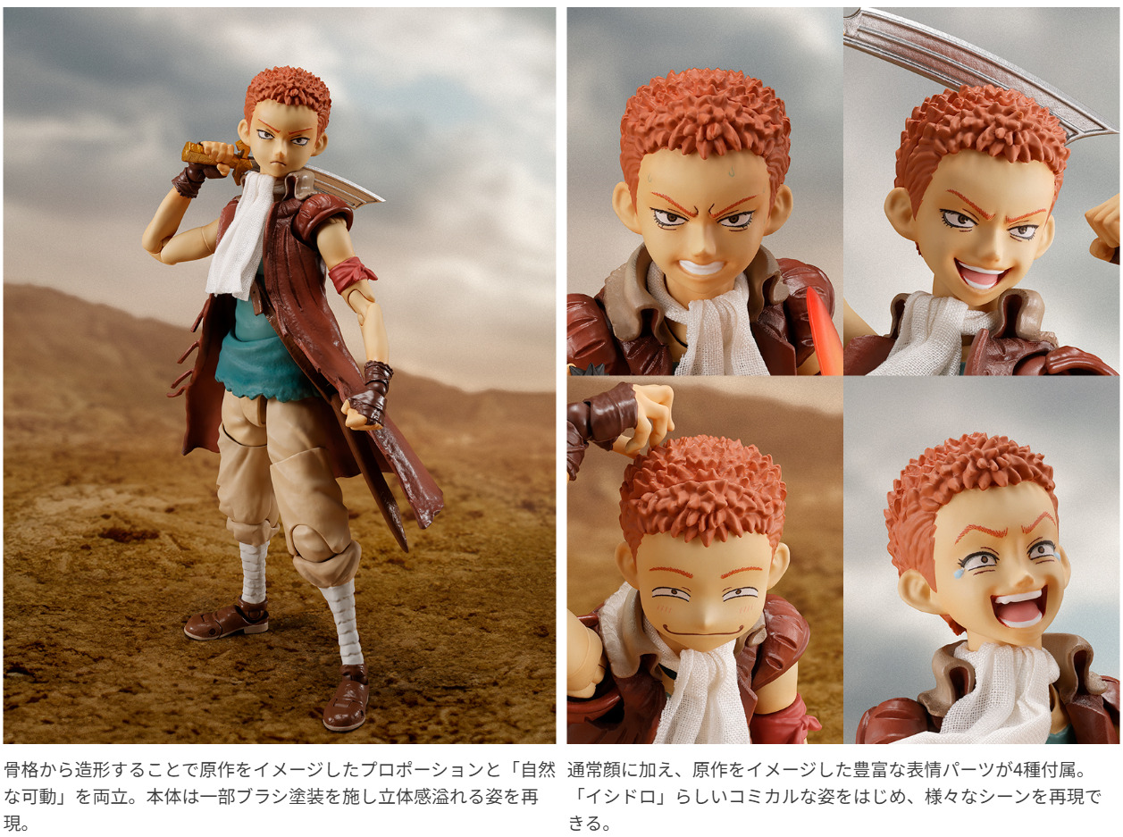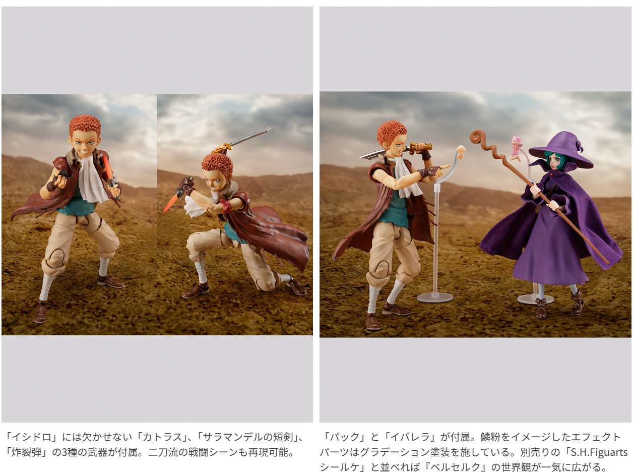 最強の剣士になることを夢見る少年、「イシドロ」がS.H.Figuartsに登場。表情豊かな「イシドロ」を表現する交換用表情パーツや、各種武器が付属。「パック」や「イバレラ」は、別売りの「S.H.Figuarts ガッツ(狂戦士の甲冑)」や「S.H.Figuarts シールケ」と並べて遊べる。