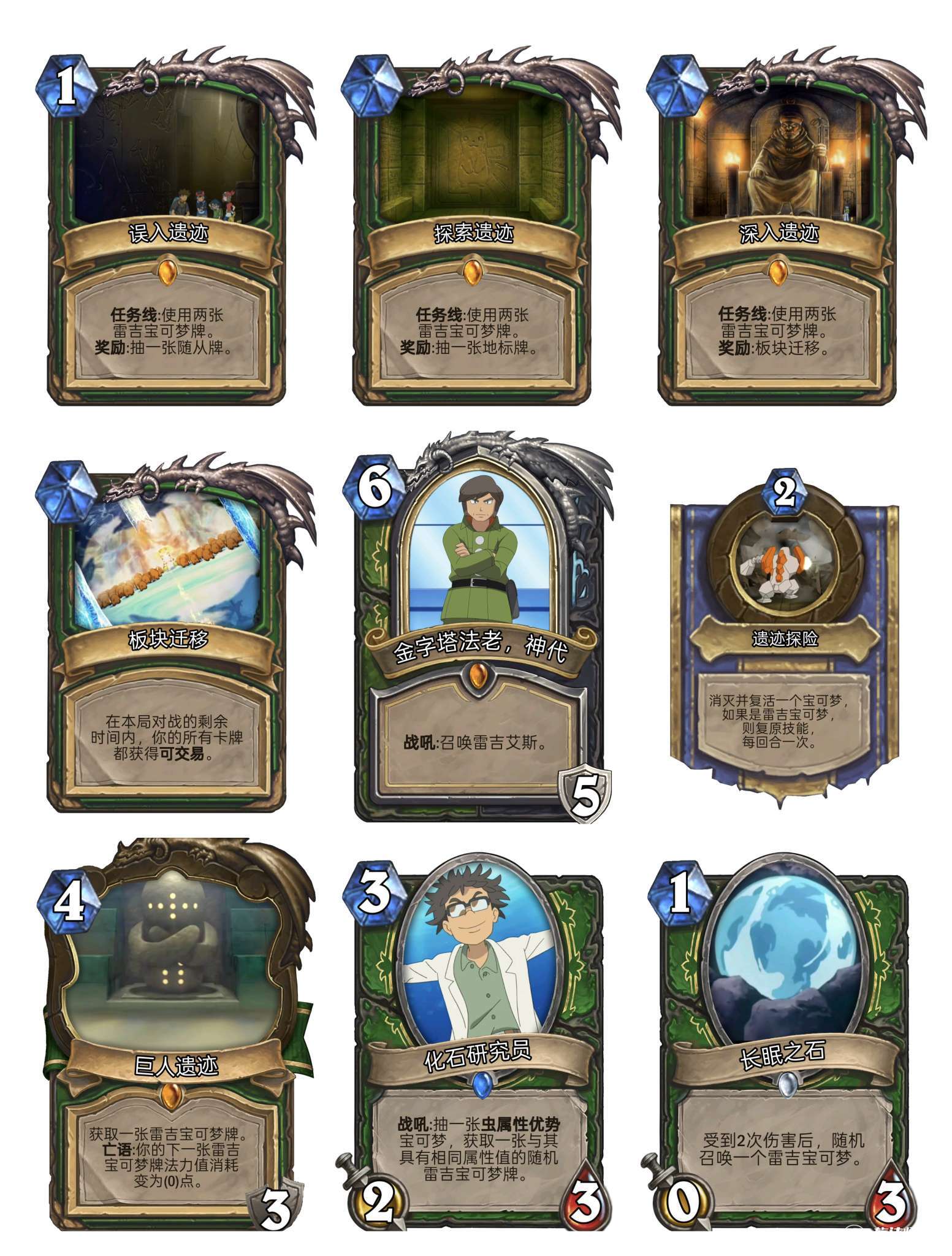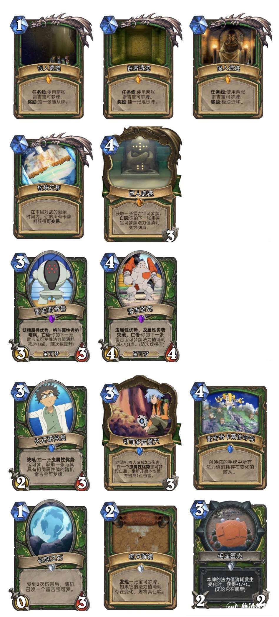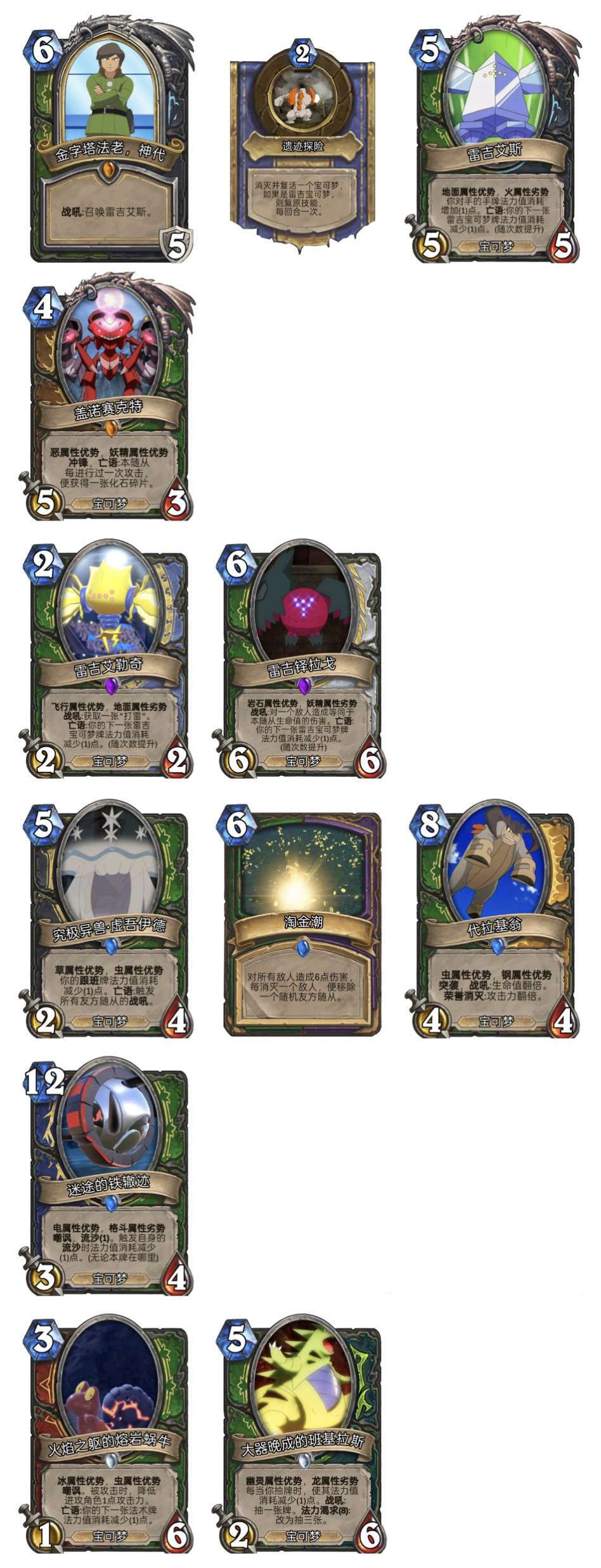 可以看到雷吉宝可梦是以减费为核心的体系,雷吉奇卡斯会成为强力终端(最高打12),但有一张牌并不是可收集卡,所以猎人一定是最适配这个体系的职业。