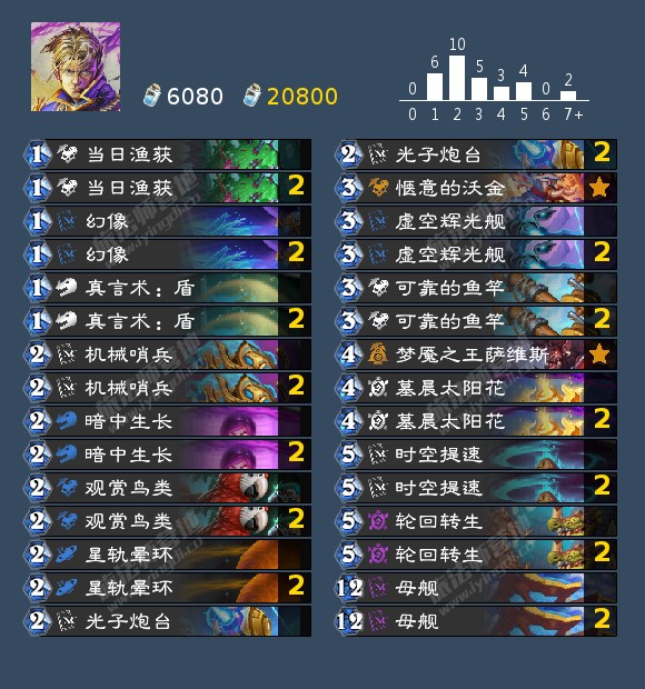 星灵牧需要合成紫卡轮回转生。卡组利用可靠的鱼竿召唤1、2、3费随从,再用轮回转生复活它们来度过前中期,其中2费的机械哨兵可以给母舰减费,而母舰能给予很多强力随从终结游戏。缺的卡可以换成大叫巨鹦、暗言术:毁、柔想。