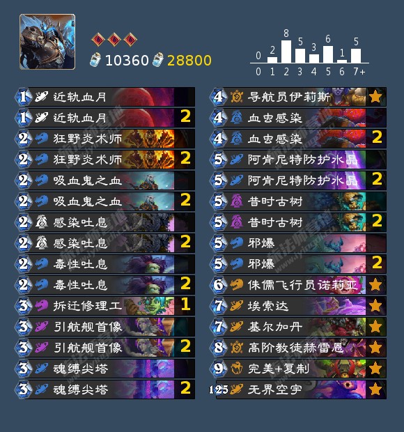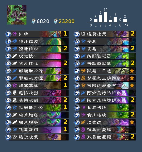 星舰DK的大星舰可以叠甲+召唤十费随从,防守的同时造出大场面。卡组星舰外的部分快攻抗性也不错。携带的伊莉斯不是免费的,但伊莉斯是目前标准的最强卡之一,在绝大部分卡组中都会携带,可以用来复制星舰,更快造出大星舰,合了完全不亏。另外8费的高阶教徒没有的话可以换成小精灵。