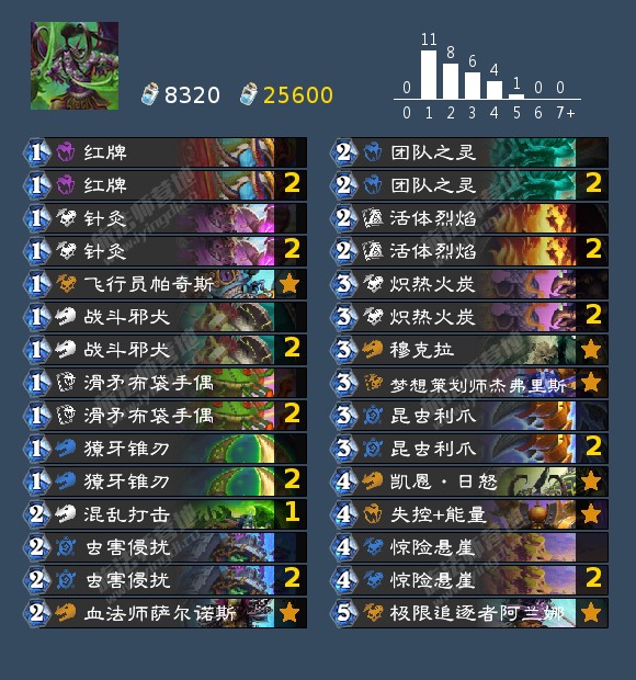 快攻瞎在前一千分段有着第五的胜率,在之前的线上赛也有过高光战绩,是现在快攻卡组的门面。卡组仅需蓝白新卡,百尘即可拿下。上手简单,前期靠低费高攻生物蹭血,中期靠直伤斩杀。缺的卡可以替换为第二张混乱打击。
