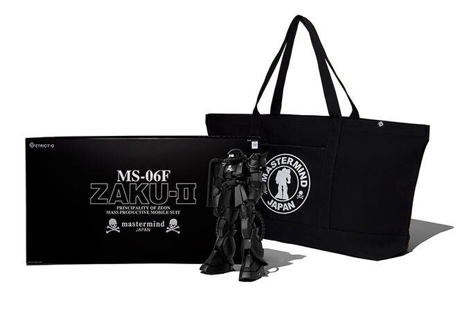 「パーフェクトグレード ザクⅡ mastermind JAPAN ver.」は超精密にメカニックを再現した究極のプラモデル「パーフェクトグレード」とコラボレーションしたアイテム。全身を漆黒に統一した成形色と、mastermind JAPANオリジナルデカールが魅力だ。ビックサイズのキャンパストートバッグも付属する。