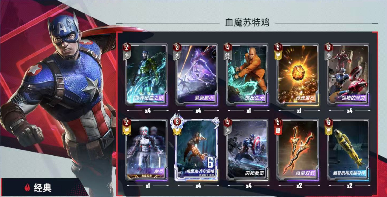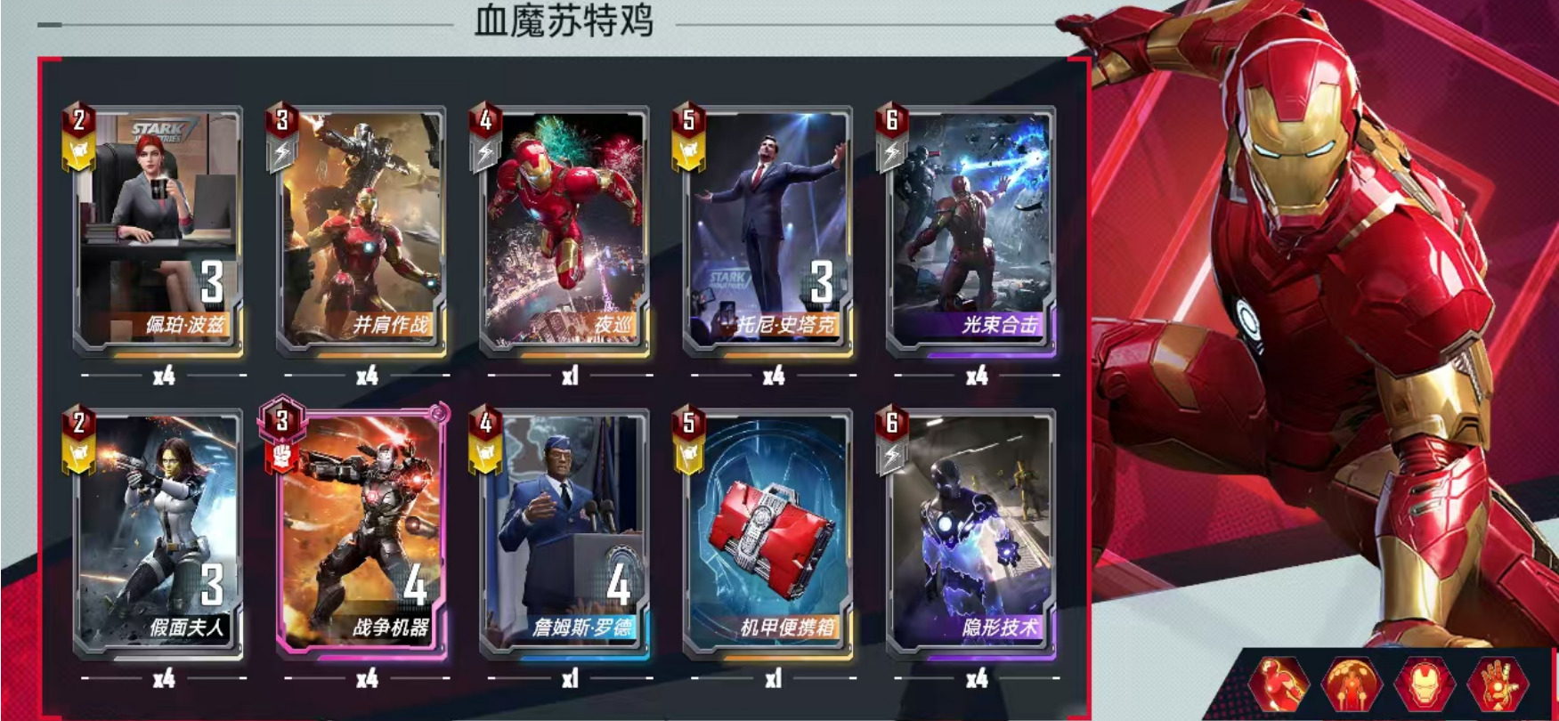5费:托尼经济核心,机甲箱凑数卖小辣椒。尽量多留两回合链接,给战争机器身材养大一点。