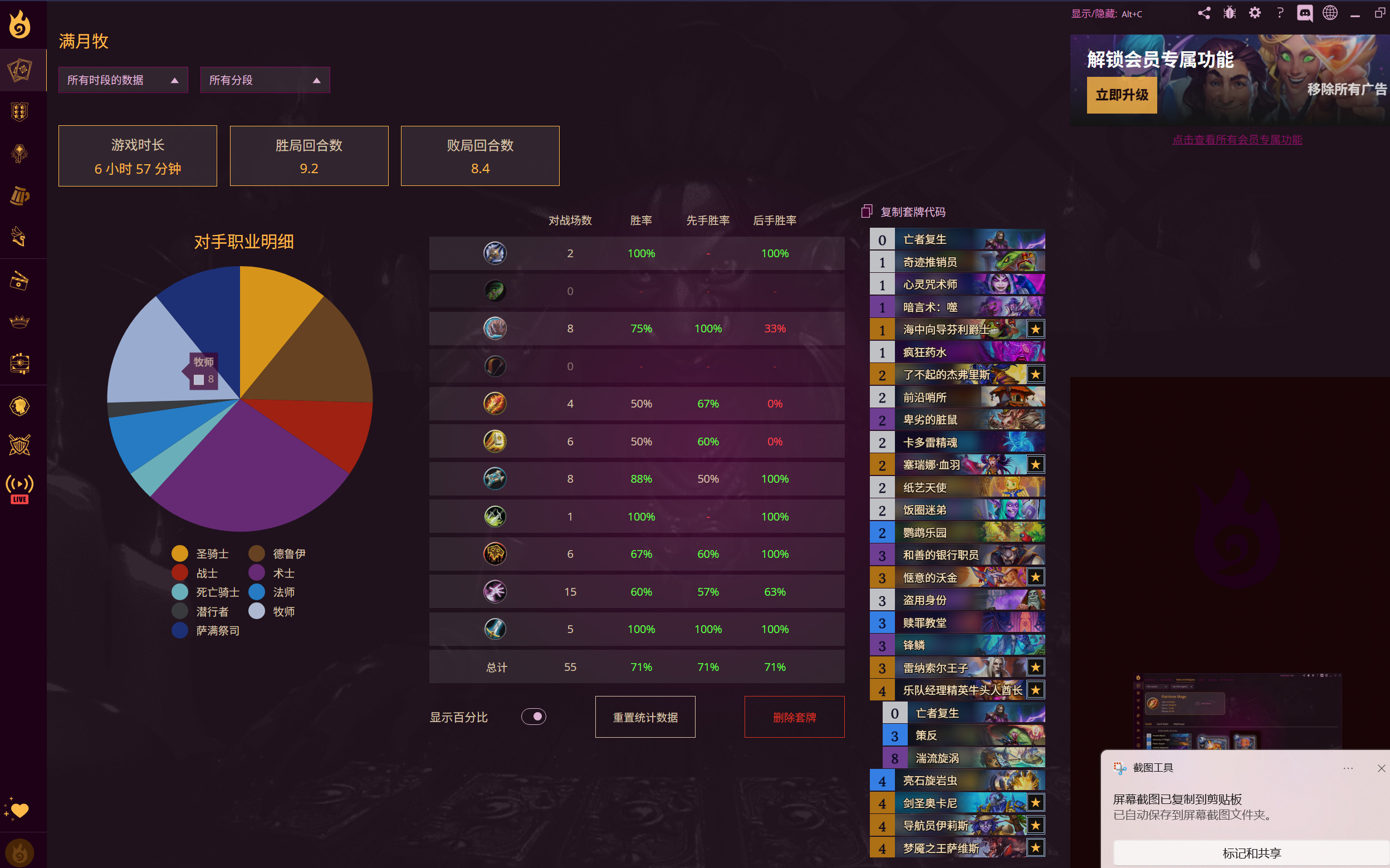 总结:输的对局基本上是天湖弃牌术,猪猪,天湖生气气,天湖大哥萨,这些卡组胡起来不管你玩的什么都不好处理,直接下一把,优势对局还是很多的,环境比较好。
