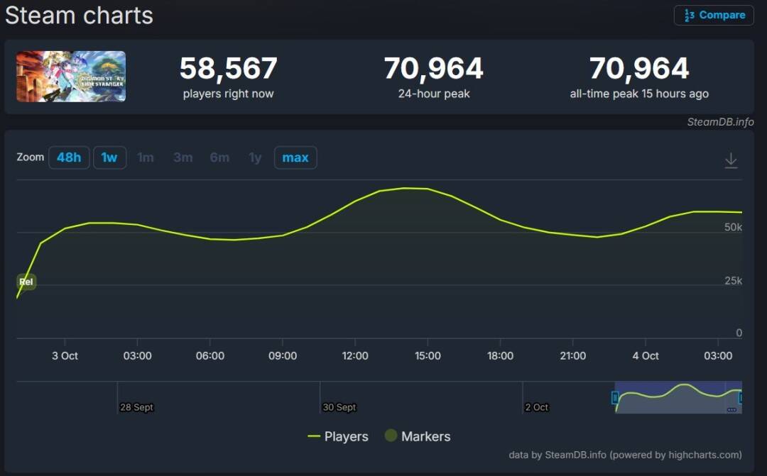 万代南梦宫新作《数码宝贝物语:时空异客》在Steam平台引发热潮,首发24小时内吸引超7万名玩家,成为该平台近期最成功的日式角色扮演游戏之一,去年仅有Atlus出品的《暗喻幻想》以超8.5万人的成绩超越此次表现。
