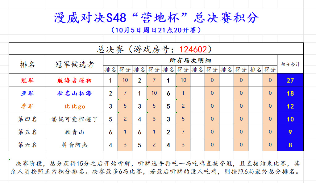 决赛阶段,总分获得15分之后开始听牌,听牌选手再吃一场吃鸡直接夺冠,且直接结束比赛,其余人员按照正常积分排名。决赛最多6场比赛,若最后听牌的没人吃鸡,则按照6局最终总分排名。