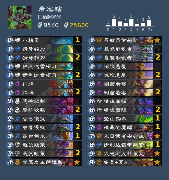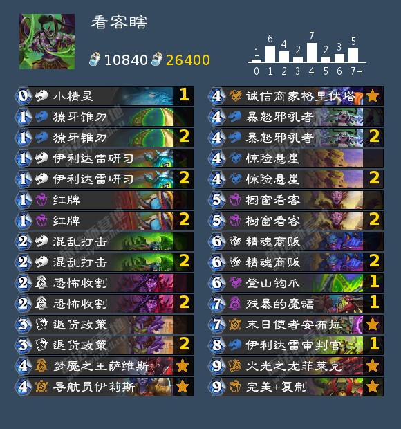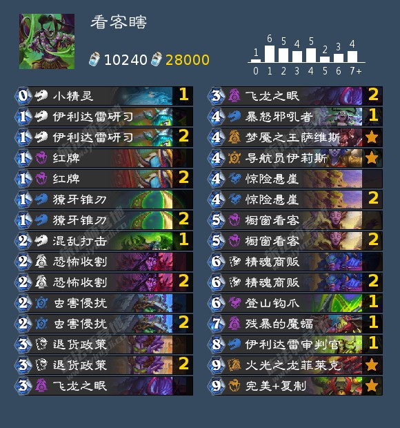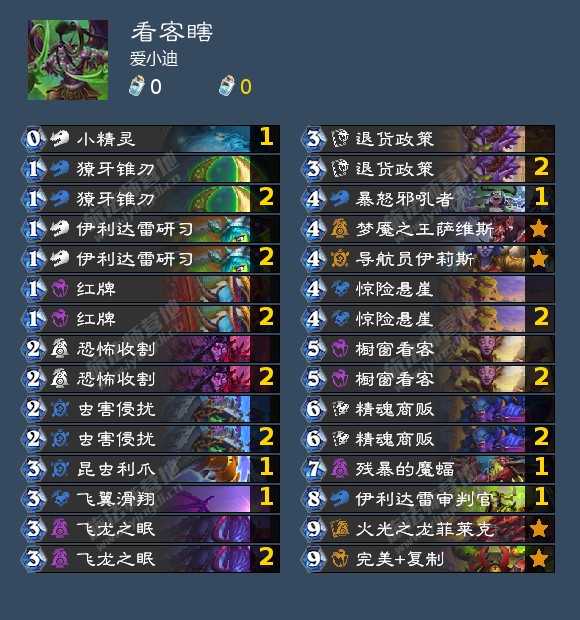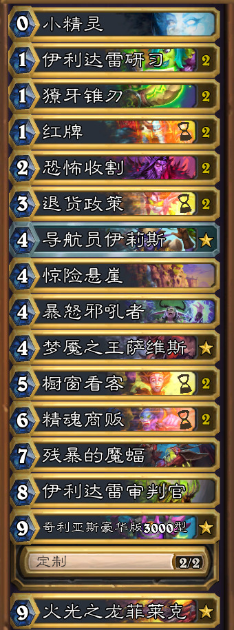 另有一点小tips:若流放位有橱窗看客、精魂商贩、暴怒邪吼者、火龙或奇利亚斯等优质单卡,可2费时直接打出寻找游荡贤者减费,使我方能够在更早回合启动。