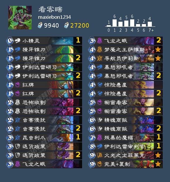致胜点二:在对手开门前通过暴怒邪吼者减费并在4-5费打出精魂商贩,利用1费复制地标送掉或手中的伤害法术(虫害侵扰或研习中的眼棱杀掉商贩)使手中的橱窗看客减至0费或火龙减至3费,瞬间膨胀场面压死对手。