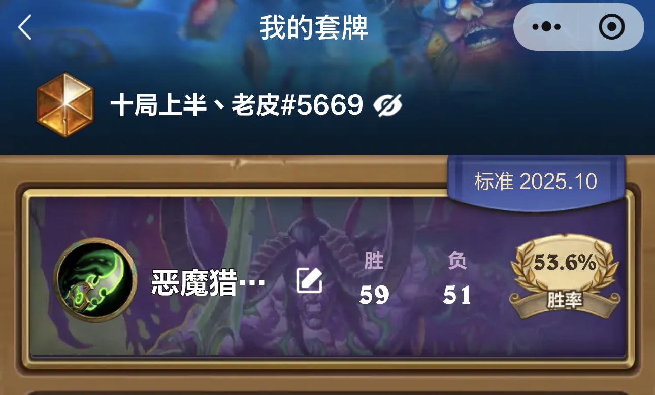而更关键的是,这套卡组同时具备扎实的实战强度:笔者老皮本月全程使用该卡组冲击传说,并在国服2000名左右的分段调整构筑、多次测试,本赛季截止至发文前共计实战110场,战绩为59胜51负(胜率53.6%)。尽管这个胜率不算特别突出,但笔者认为,只要熟练掌握各对局的打法思路,并根据自身风格优化出最优构筑,这套卡组的胜率完全有望突破55%,甚至达到更高水平。