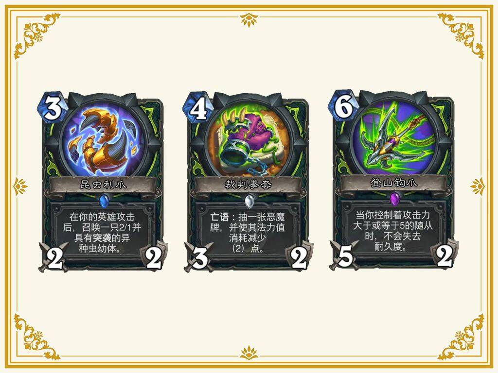昆虫利爪是一张不错的3费解场武器,唯一的问题就是作为一张3费武器攻击力太低了,且在携带飞龙之眠的情况下或可以后手硬币跳4费曲线时,我方大概率会有更好的选择;