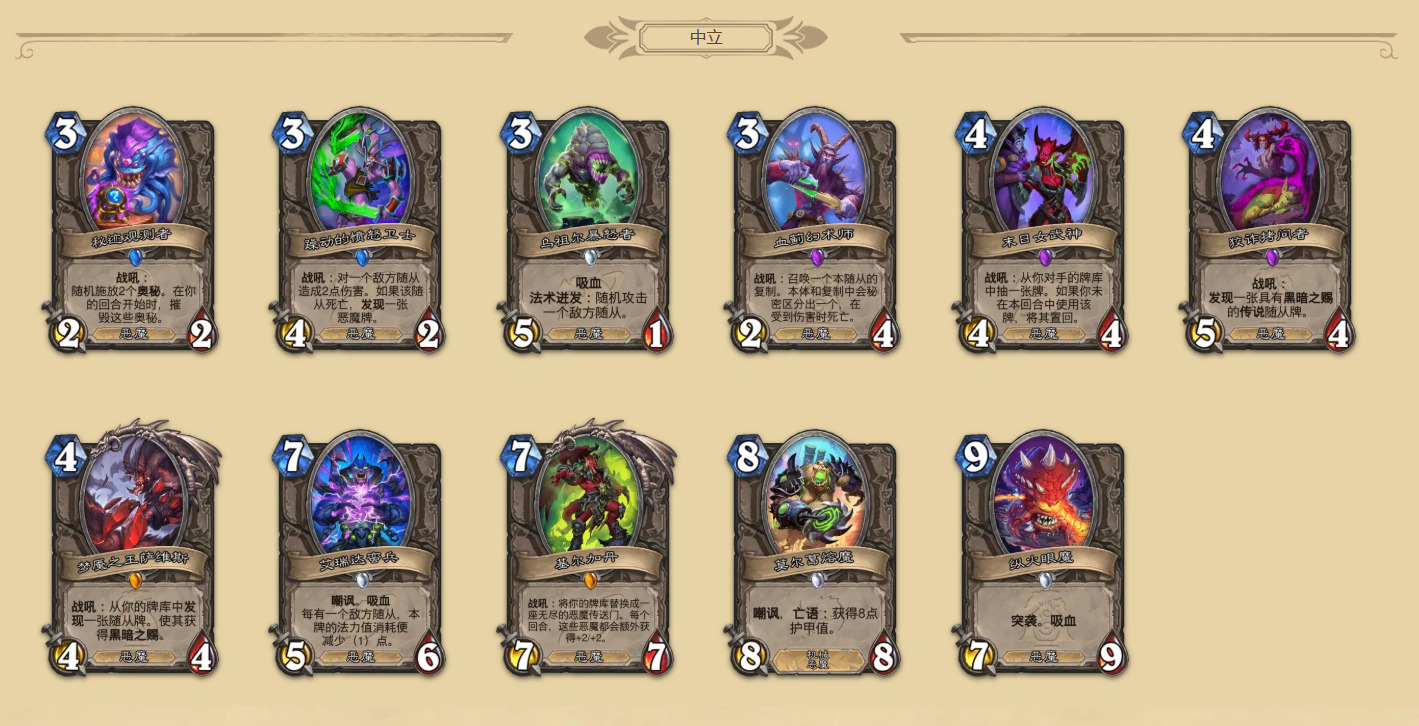 其中的优质恶魔:精魂商贩、星辰毁灭者、残暴的魔蝠、愤怒的女祭司、艾瑞达蛮兵、伊利达雷审判官、玛瑟里顿、莫尔葛熔魔、纵火眼魔。