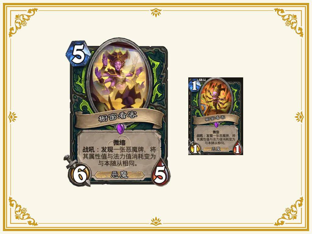 在“精魂商贩”上场后,次回合甚至当回合触发其亡语效果后使手牌中的“橱窗看客”减至0费并打其本体和0费发现的优质恶魔以及微缩的1费小看客本体和1费发现的功能性恶魔的爆发场面,其次可减费卡组中的“火光之龙菲莱克”、“残暴的魔蝠”、“伊利达雷审判官”和“奇利亚斯”等优质随从压低对手血线或使场面迅速膨胀。