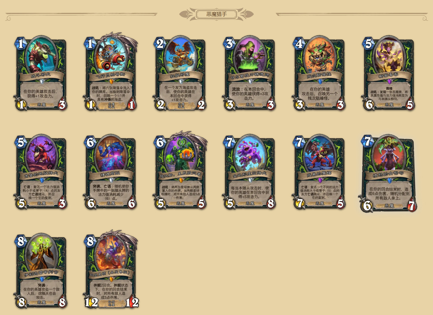 今天为大家介绍的这套卡组——精魂看客瞎,在当前形态多样的恶魔猎手卡组中,可以说是最贴合“节奏当道”标准环境的构筑思路。 该卡组的诞生初期,是携带多张大哥纯减费体系,后续随着版本更新后伊莉斯的加入,卡组进一步精简了随从数量,最终转型为一套以中期爆发为核心的节奏型卡组。