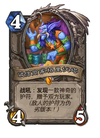 除此之外,在对抗这两套卡组时还需特别注意在打出精魂商贩后何时该防格里伏塔的“精控”,避免一卡崩盘。我们需要做的是节奏优势可防,节奏劣势则不防,若能够在打出商贩后送掉场面上的其他随从可以直接送掉。