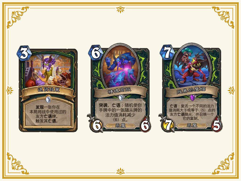 而退货政策除了可触发卡组中原本已存在的3张亡语单卡:獠牙锥刃、精魂商贩、残暴的魔蝠外还会触发发现的其他所打出的亡语牌,如橱窗看客中发现的莫尔葛熔魔和年兽和伊莉斯制造的亡语地标,因此在选取时需要根据己方的游戏计划而选择。