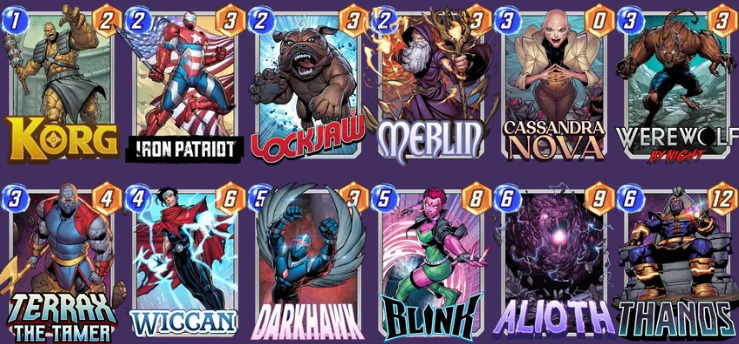 主要在美服流行的构筑,用以应对环境中大量的【阿里瑟姆】。相比于传统【黑鹰】卡组增添了卡组灵活性和趣味性,通过【灭霸】宝石及低费高质量单卡度过前期,同时利用【锁齿狗】和【闪烁】博取上限,以便更好推进到依靠【黑鹰】或【灭霸】单卡制胜的回合。整体玩下来对个别宝石的上手率要求较高,在此推荐给各位【灭霸】拥趸或觉得环境无聊的朋友。