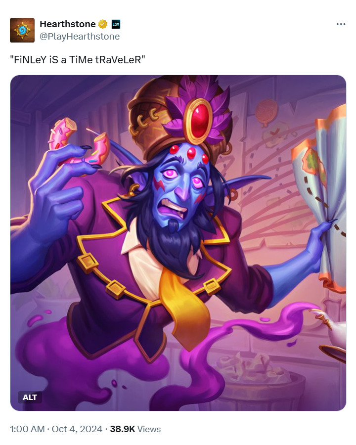 就在几乎整一年前,炉石官推就在不经意间借杰弗里斯之口预告过芬利是穿越者。