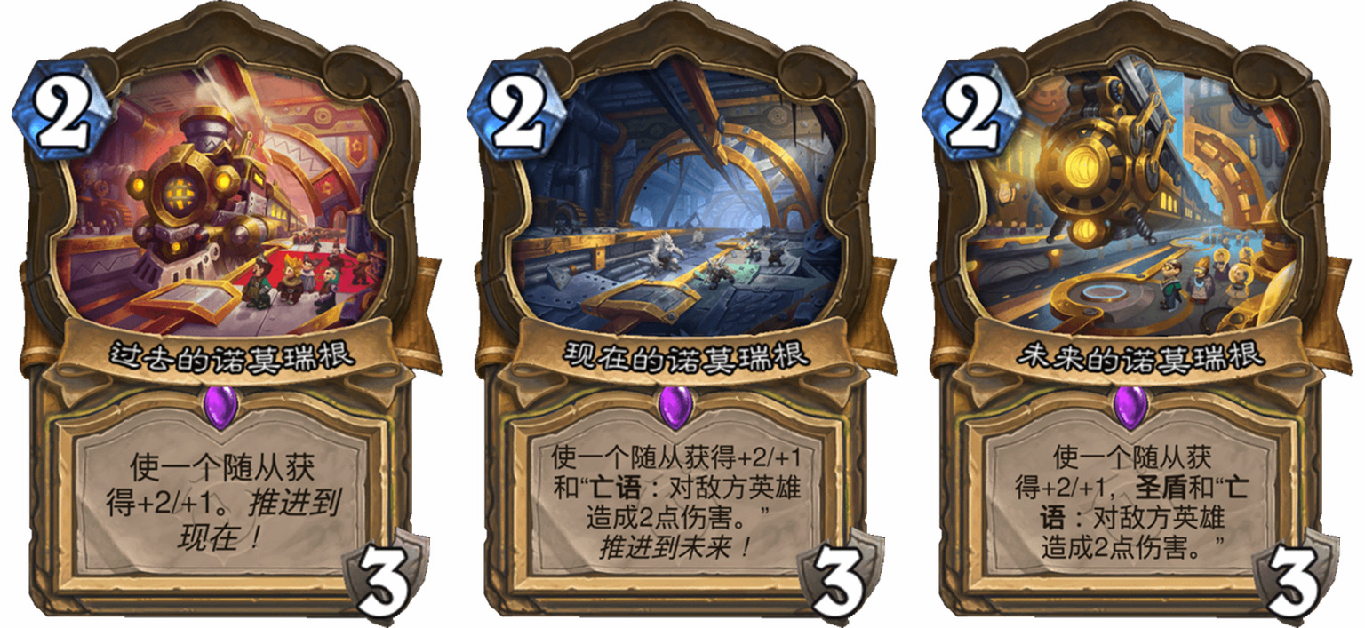 诺莫瑞根在过去(穴居人入侵前)+2/+1因为2/1是很多侏儒的身材;现在(辐射污染)多了亡语,对应麻风侏儒;未来得益于神圣/圣光科技重建,体现为圣盾。