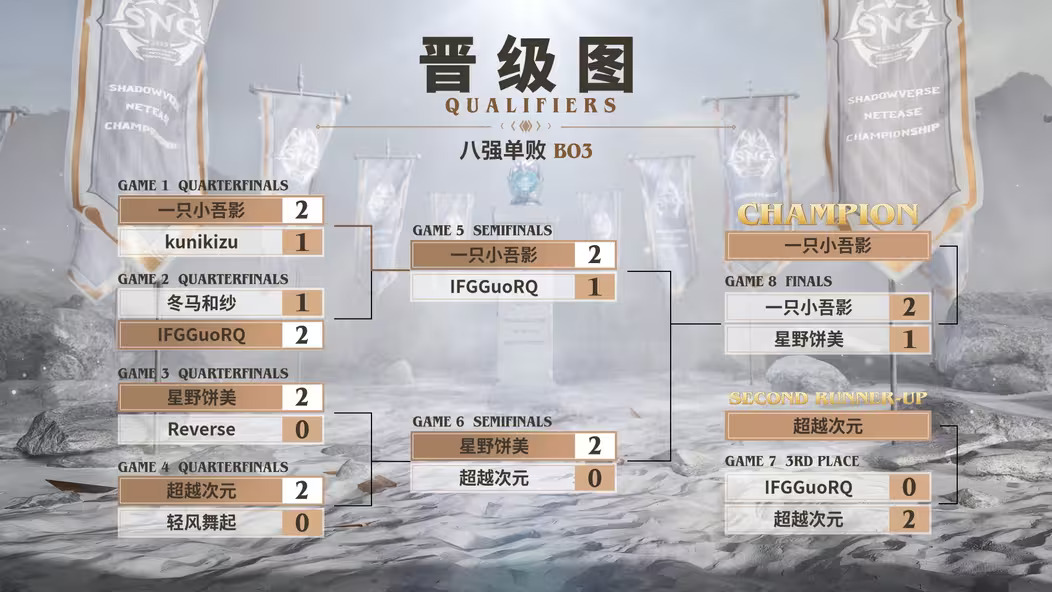 恭喜一只小吾影以2:1的比分战胜星野饼美选手,成为SNC2025年度总决赛的冠军!