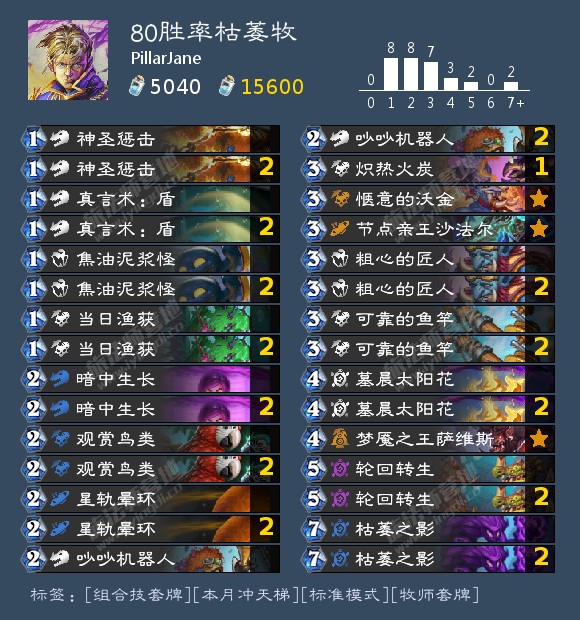 钻石开打到传说3w名一直用的这套,除了起手节奏拉满的贼术dk都能打。唯一细节是有卡组带沉默和格里伏塔,必要时候记得先把自己绷带哥解掉。