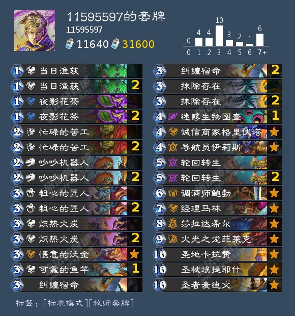 有花茶,鱼竿,绷带比较容易修到42血的,这套偏控制苟活,轮回转生复活2费的吵吵或者苦工都是可以的,一个给地标减费一个抗快攻,后期靠着刀打,挂着刀火龙可以双倍,甚至打慢速3费的法术可以多找火龙,伊利斯王哥都可以找伤害,打快攻就找奶解