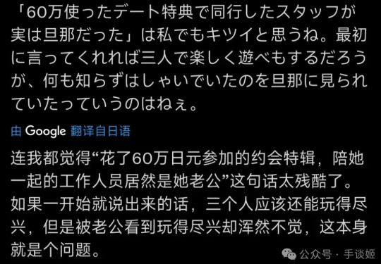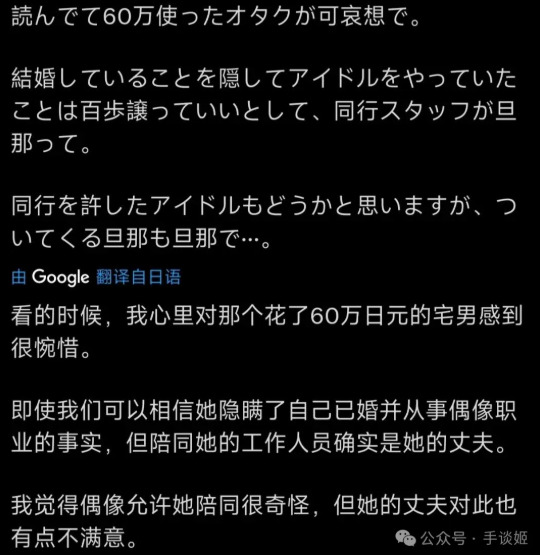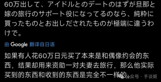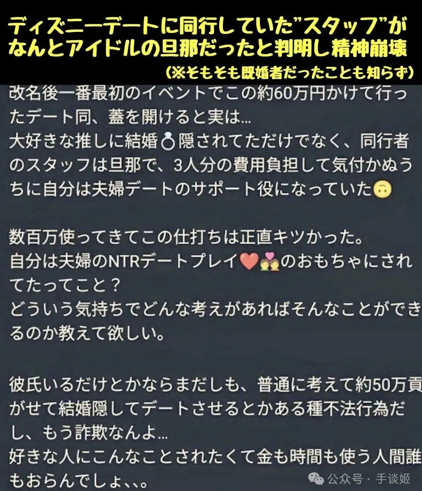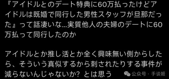 “为了和偶像约会的特典花了 60 万,但偶像已经结婚了,同行的男性工作人员是她丈夫”,这事儿也太离谱了…… 实际上是花 60 万和别人夫妻一起约会了吗?对偶像和推活没任何兴趣的人来说,会觉得“正因为这种做法所以偶像刺伤事件才无法减少吧?”