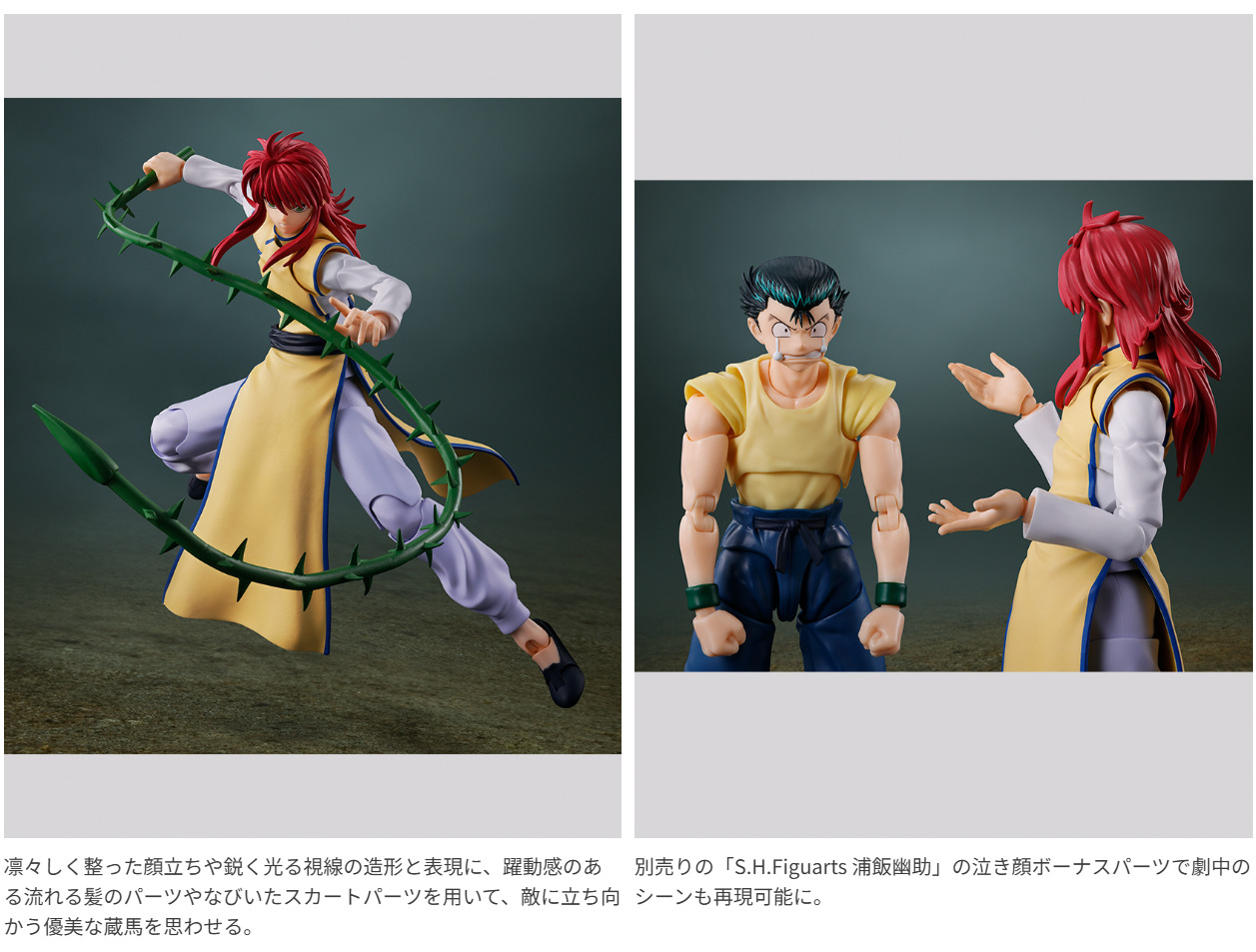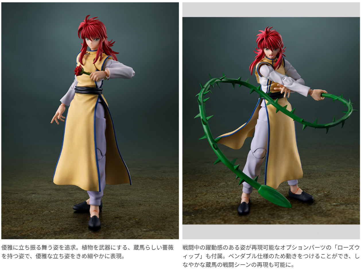 暗黒武術会編に登場した、対戸愚呂チームとの戦闘時の衣装の「蔵馬」が、S.H.Figuartsに初登場。優雅に立ち振る舞う姿を追求。そして戦闘中の躍動感のある姿が再現可能なオプションパーツの「ローズウィップ」も付属。植物を武器にする蔵馬らしい薔薇や持ち手も付属しており、別売りの「S.H.Figuarts 浦飯幽助」の泣き顔ボーナスパーツで劇中のシーンも再現可能に。