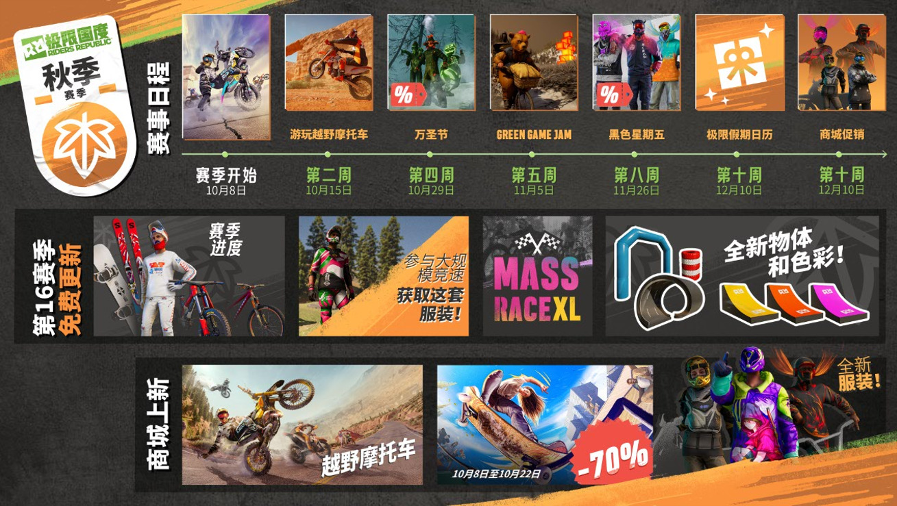 随着《极限国度》第16赛季的推出,越野摩托车今日轰鸣登场!即日起至13日,在PlayStation、Xbox和PC平台的《极限国度》免费周末期间,通过Ubisoft Connect免费体验越野摩托车(以及整个游戏)。购买正式版延续你的游戏进度,更可享受高达2.5折的优惠,畅享新赛季的精彩内容:游戏四周年纪念活动、万圣节、绿色游戏大赛、假日季,以及全新的“大规模竞速XL”!