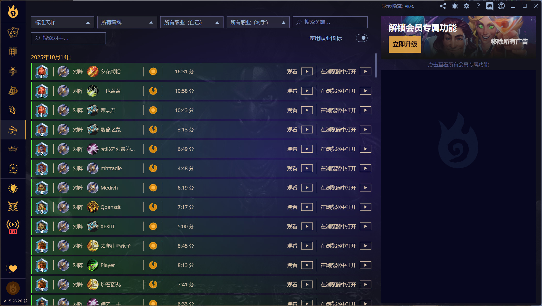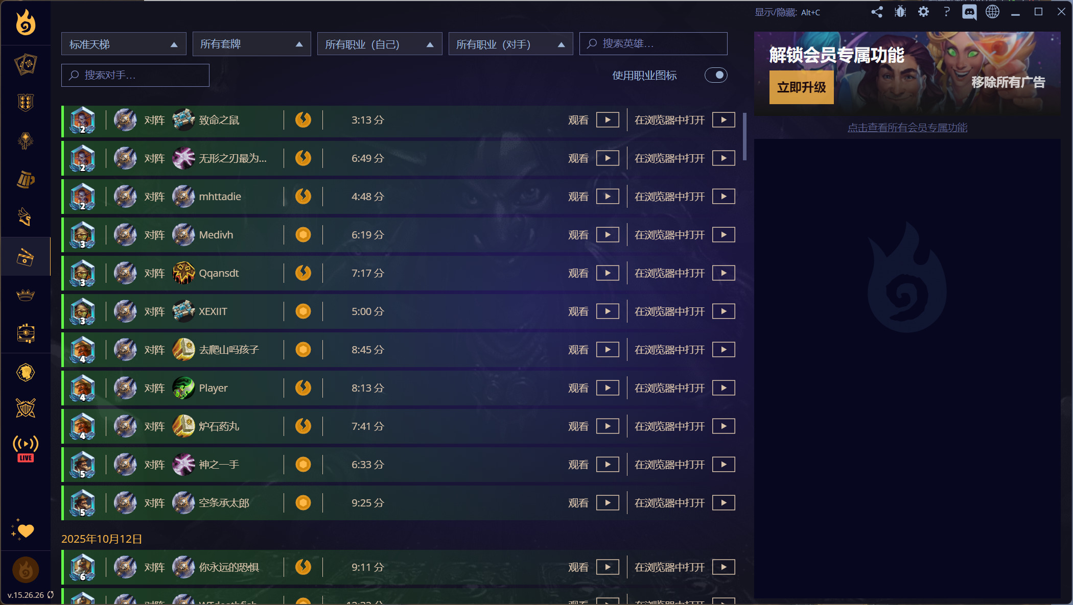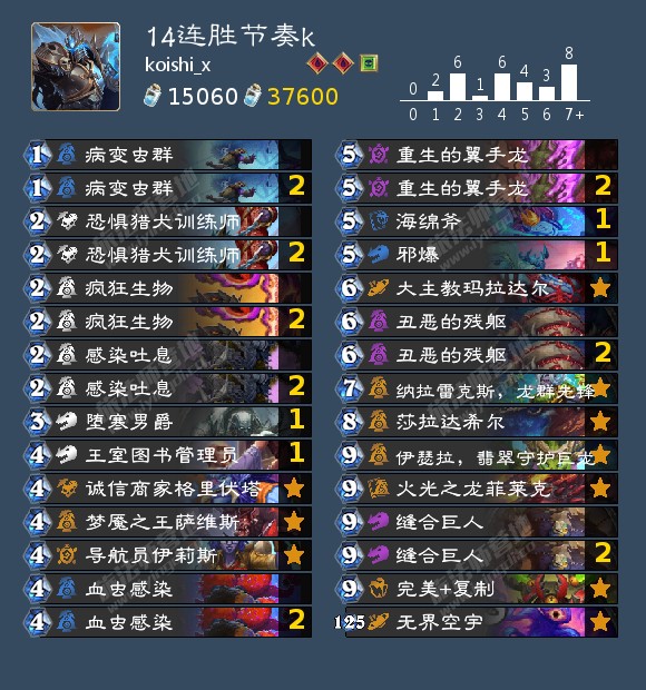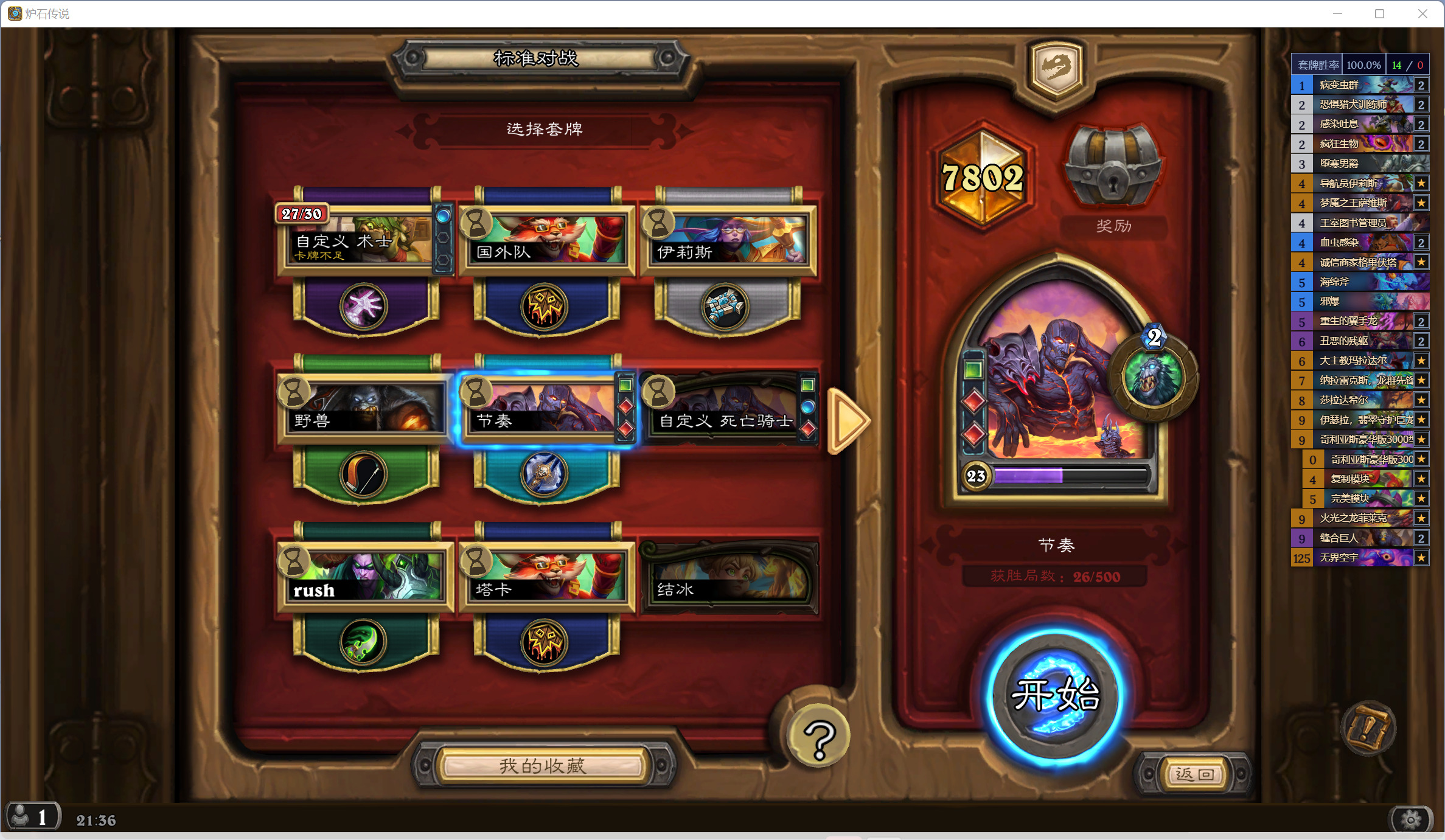 算是我狗运比较好吧,留档纪念一下。赢了一个脚本k,一个蛋术,一个星舰术,两个鱼人骑,一个星舰瞎,一个星灵牧,一个龙牧,一个满月牧,一个节奏贼,一个任务法,一个(开局亮绿龙而且有一堆星云萨的牌的很奇怪的)任务萨,两个星舰k,零个任务术(不过节奏k也不是很怕任务术就是了)。