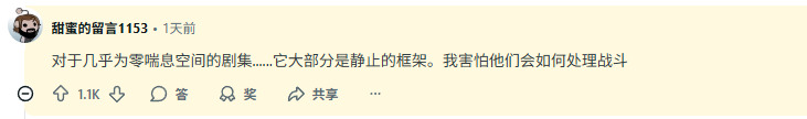 “这一集几乎没有任何喘息空间……大部分都是静帧。我真担心他们之后要怎么处理战斗场面。”一位Reddit用户在第1集讨论帖中写道,这也反映出目前意见的分歧。