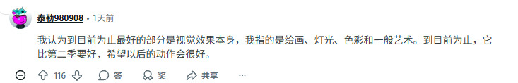 不过,也并非所有评价都是负面的。一些观众认为新一集在视觉上已经比第二季有所进步。“我觉得目前最棒的部分是画面本身——也就是作画、光影、色彩和整体美术风格。从这点来看确实比第二季更好,希望之后的动作戏也能保持水准。”一名Reddit用户评论道。