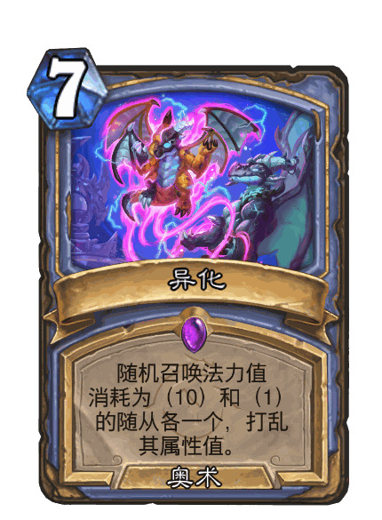 随机召唤法力值消耗为(10)和(1)的随从各一个,打乱其属性值。
