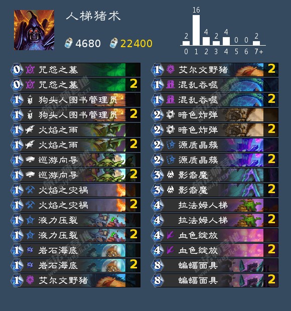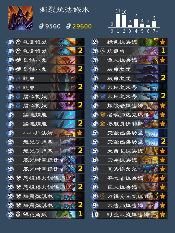 接下来再来谈谈另一个我在标准跳过的卡片——拉法姆人梯。标准跳过他的理由很简单:标准卡组他约等于4费抽3,这样的过牌实在是没什么意义,对于术士更是如此。虽然看上去是个检索,但是标准要么是伊利斯体系,要么是任务术,二者都无法让拉法姆人梯达到“检索”的效果,而单纯作为抽牌术士则不太需要。那么如何让他变成“检索”呢?我的思路是,尽可能压缩费用,将卡组大部分卡片的费用曲线集中在约3-4个个费用内,然后剩下的费用用需要检索的单卡填充,根据旧卡的案例判断,这种检索不会受到同费用卡片浓度的影响,因此可以尽可能抽到你要检索的卡牌。这个思路显然标准是很难做到的,而能压缩费用的任务术则是没有需要他来检索的卡片,因此标准他直接死刑了——但是狂野显然就不一样了不是吗?