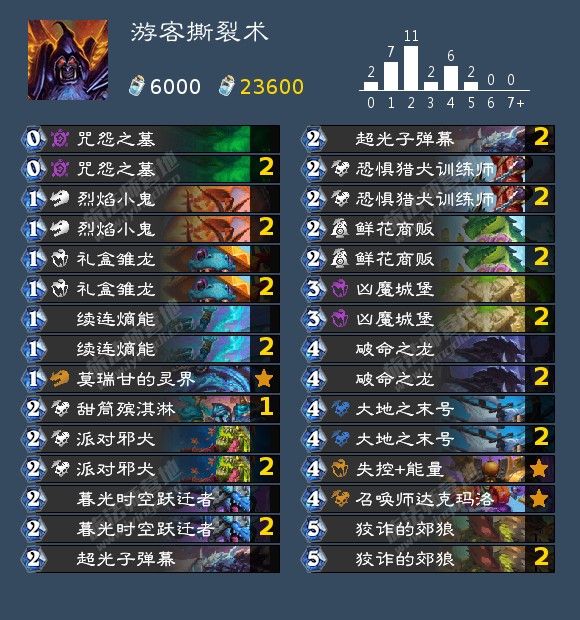 作为案例的,携带了游客体系的撕裂术,可以注意到我把灾毁迅疾幼龙直接踢了。实际上他的曲线我一直觉得略高,好处当然是曲线更低了,往半铺场思路走,大地之末号也算一个备选的用于给狡诈的郊狼减费的卡片,如果前期12费能铺场那么3费哪怕是353的狡诈的郊狼也未必不可接受;坏处则是龙的浓度进一步降低, 剩下4张龙能不能撑起来使用其实要打个问号,但是卡组流畅度大概率是能提高一点的。
